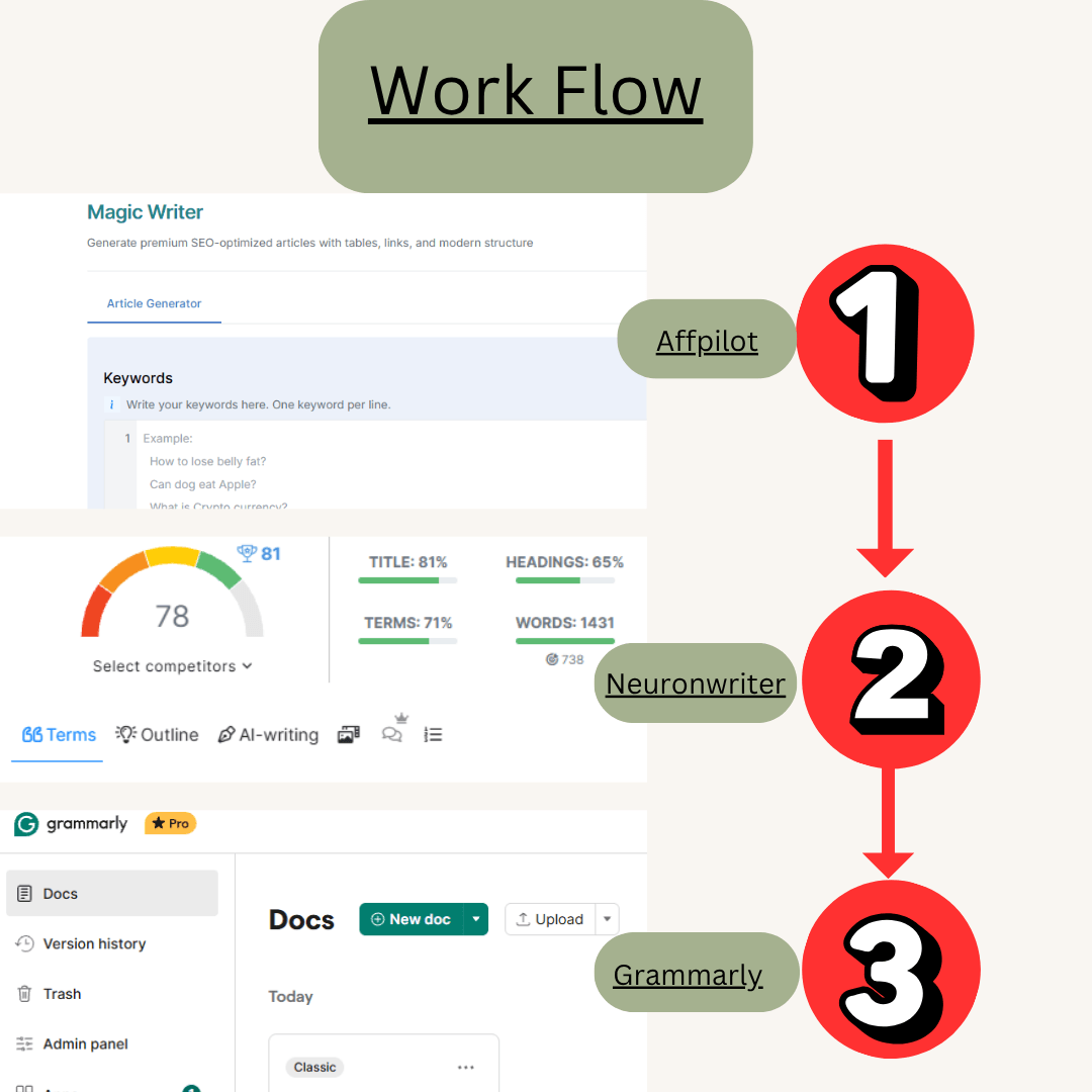 I use Affpilot + NeuronWriter + Grammarly + ChatGPT