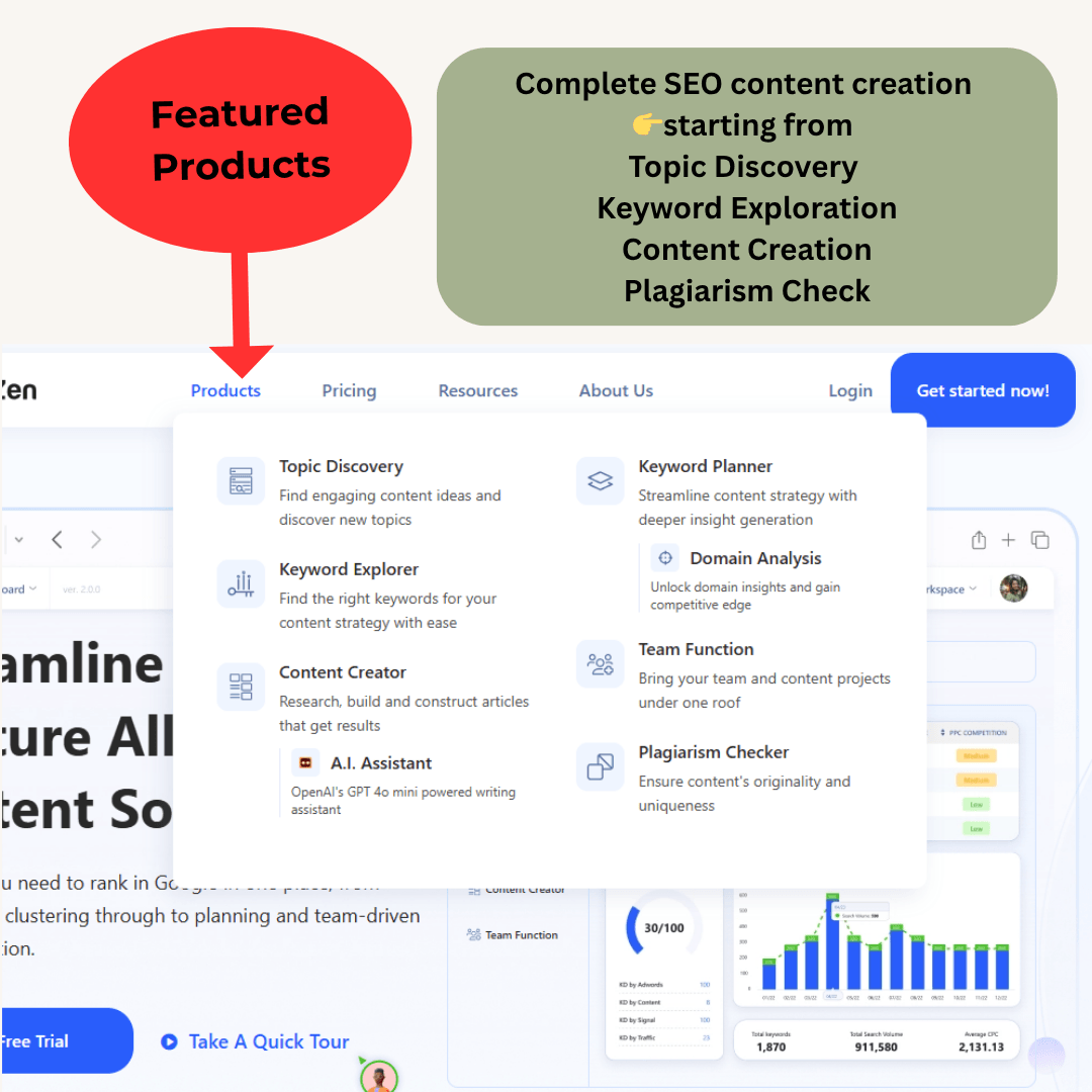 WriterZen includes modules like Keyword Explorer, Topic Discovery, and a Content Creator tool to help optimize your SEO strategies.